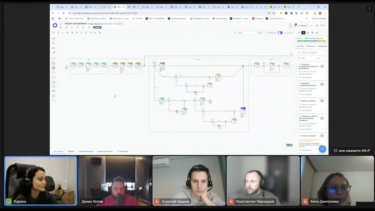 Карина начала с классического разбора модели: выделила пять групп операций — приём, диагностика, ремонт, контроль качества и выдача. Она зафиксировала высокую вариативность операций (CV > 50%) и предложила три сценария: