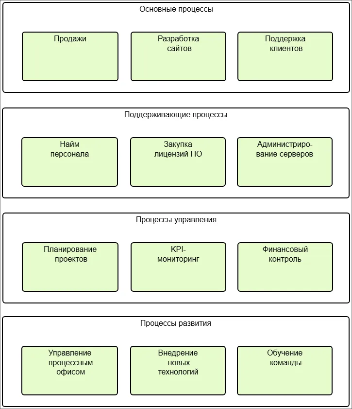 - Поддерживающие: «Найм персонала», «Закупка лицензий ПО», «Администрирование серверов»