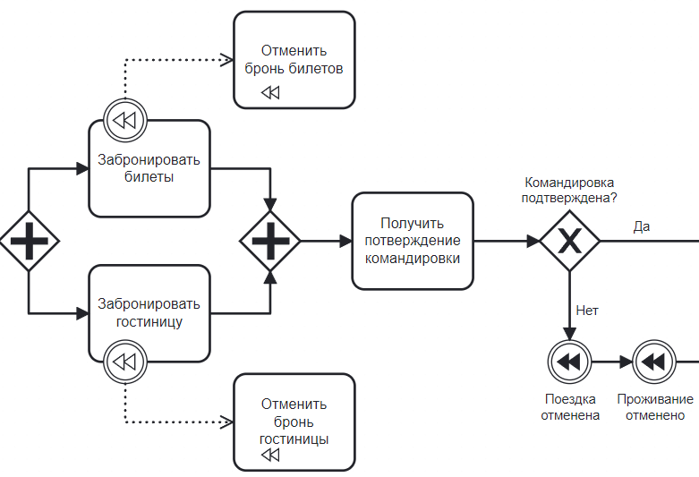У события-обработчика компенсации, прикрепленного к верхней задачи отсутствует выходящий поток и задача по её отмене.