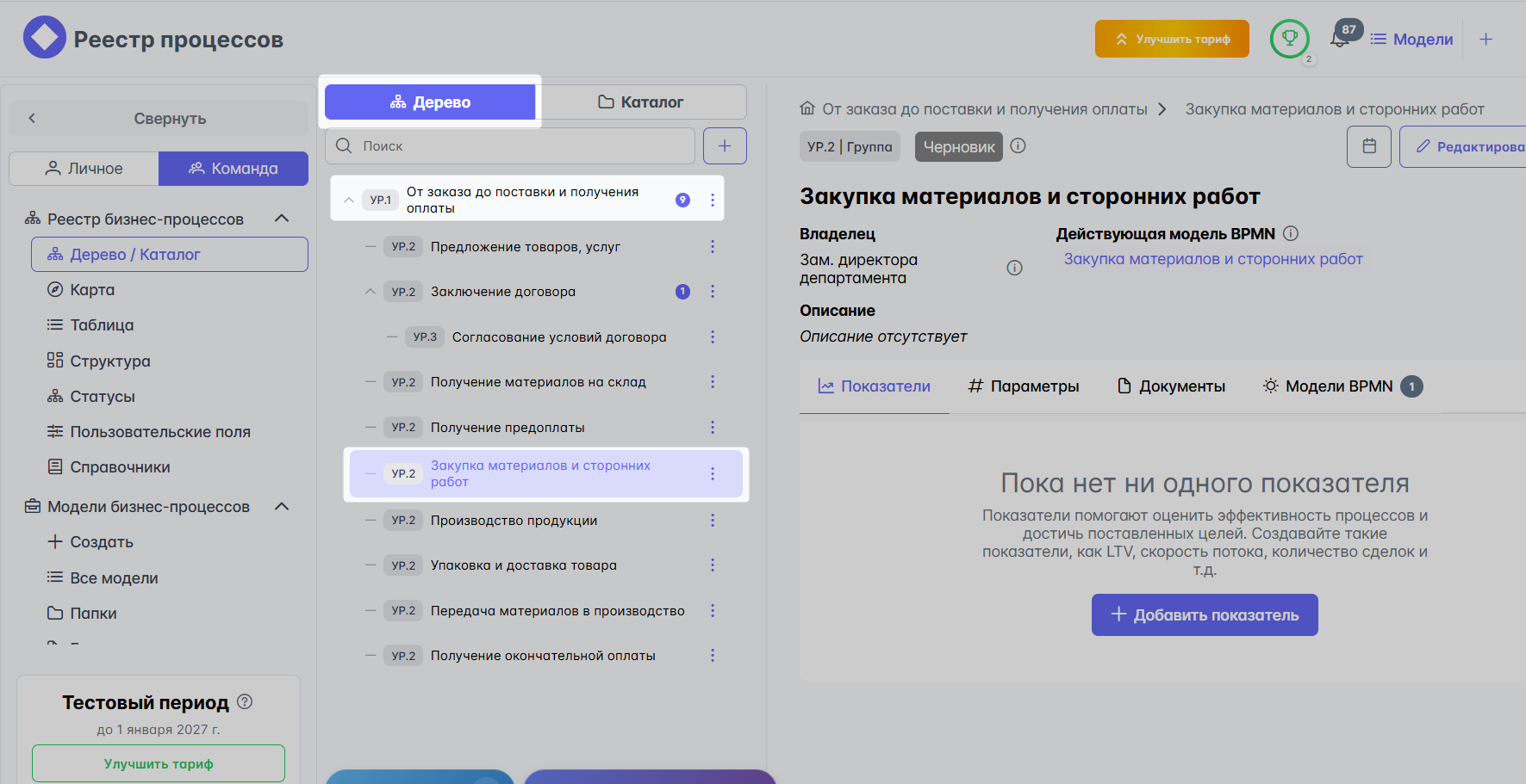 Например: процесс «Закупка материалов и сторонних работ» в иерархии, в дереве находится под сквозным процессом "От заказа до поставки и получения оплаты".