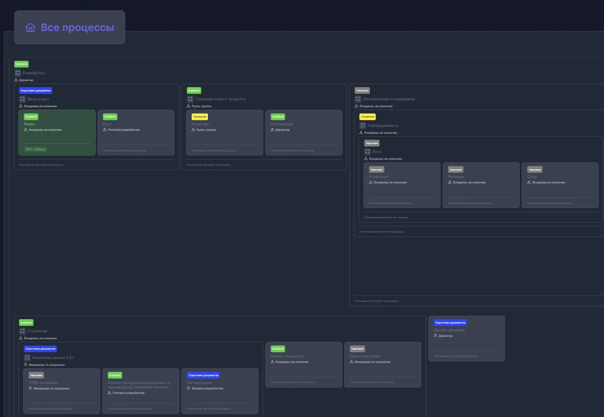 Создайте иерархию процессов с папками, тегами и фильтрами. Назначьте владельцев, установите статусы зрелости — и сразу видьте, какие процессы требуют внимания.