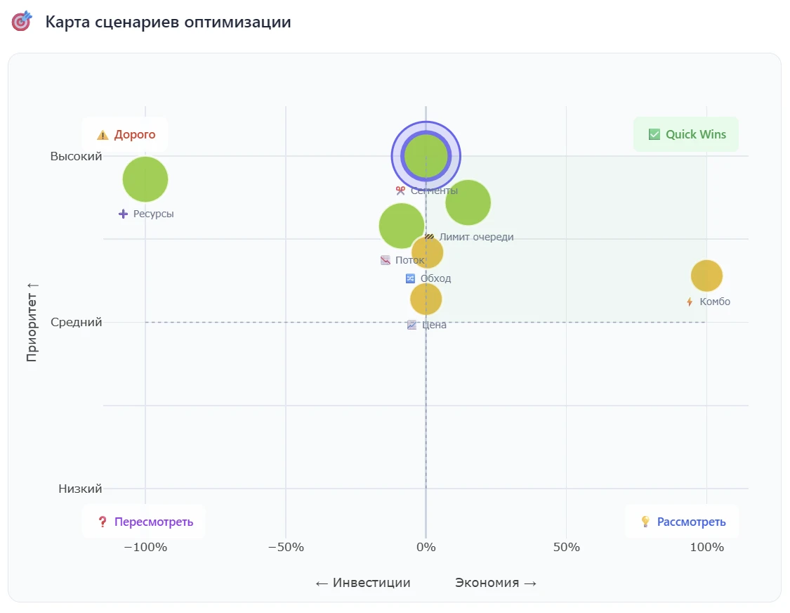 45 научно обоснованных сценариев оптимизации: добавить ресурс, изменить приоритет, распараллелить. AI не просто выдаёт «+15% throughput», а объясняет механизм: «Добавление 3-го оператора устранит очередь в узком месте, согласно теории ограничений Голдратта. ROI: окупится за 2.3 месяца при текущей стоимости простоя».